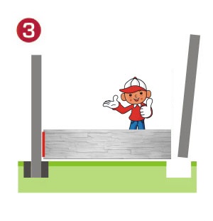 Setzen Sie die zweite Säule in das ausgehobene Loch ein und prüfen Sie mit einer Wasserwaage. Die Säule umleiten, die erste Platte in die Nuten der Säule einlegen. Überprüfen Sie das Gleichgewicht der Säulen und die Oberseiten der Platten mit einer Wasserwaage. Betone die zweite Spalte.